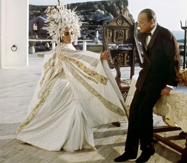 Taylor brilliert in „Boom!“ auch deshalb, weil der Film sie ideal zur Geltung bringt. Sie trägt extravagante Roben vom Modehaus Tiziano of Roma, für das damals ein noch junger Karl Lagerfeld schneiderte. Besonders ein angeblich vom japanischen Kabuki-Theater beeinflusstes Kostüm, das Flora bei einem Dinner präsentiert, ist wie von einem anderen Stern: purer, extravaganter, glitzernder Überschwang, gekrönt von einem mächtigen Kopfschmuck, der an einen explodierten Igel, einen Kronleuchter oder Andersens Schneekönigin denken lässt. Floras erfolglose Versuche, Christopher zu dominieren, offenbaren sich auch in ihrem Drang, ihn zu verkleiden. Erst steckt sie ihn in einen rosa Bademantel, später in ein altertümliches Samurai-Gewand.